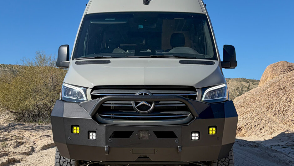 The Aluminess Front Winch Bumper for the 2025+ Mercedes Benz Sprinter features a true bolt-on installation requiring no drilling, helping simplify the upfit process for both individual owners and commercial builders.Â